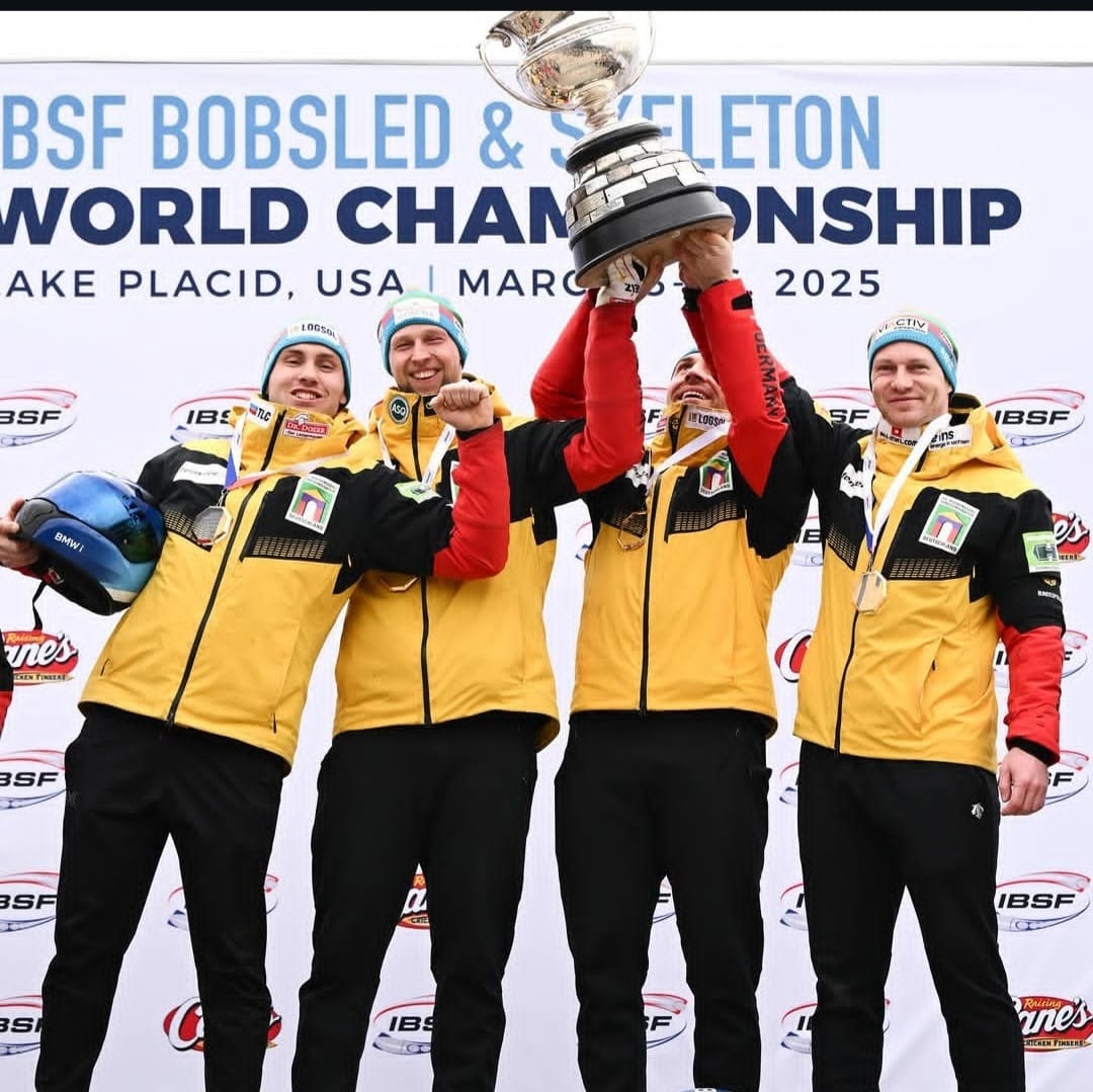 - Felix Straub (l.) gewann 2025 zum zweiten Mal den WM-Titel im Viererbob mit dem Bobteam Friedrich. Foto: IBSF